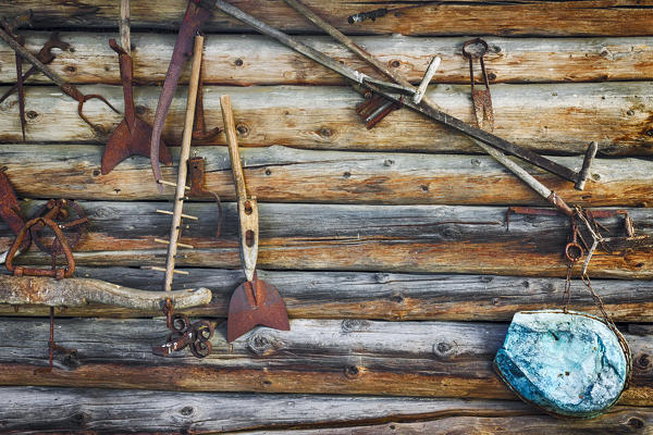 Old farmer's tools, Soglio, Maloja region, Canton of Graubunden, Bregaglia valley, Switzerland, Europe,rusty