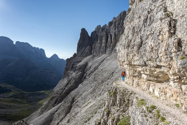 Sesto / Sexten, province of Bolzano, Dolomites, South Tyrol, Italy. Climber on the via ferrata