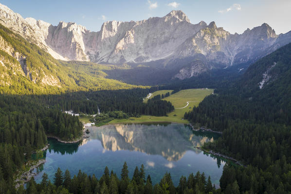 Aerial view of superior Fusine Lake with Mount Mangart on the background. Fusine Lakes Natural Park, Tarvisio, Udine province, Friuli Venezia Giulia, Italy.