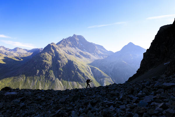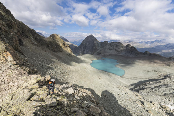 Hikers on rocks with Piz Polatschin on the background, Lej Lagrev, Silvaplana, canton of Graubünden, Engadine, Switzerland