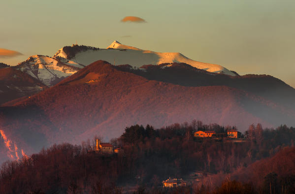 Sunset on Generoso mount, Alpe Caviano (Mendrisio district, Canton of Ticino, Switzerland), Santuario dell’Assunta (Drezzo, Como province, Lombardy, Italy), Europe