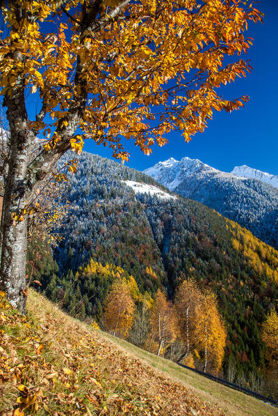 Autumnal colors in the Bitto valley contrasting with the bright white of the snow-capped peak of Mount Azzarini Albaredo, Orobie alps, Valtellina, Sondrio, Lombardy, Italy Europe