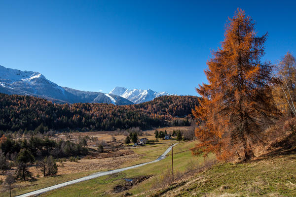 The rich oranges of the trees in the Trivigno plain contrasting with the whites of the snow-capped peaks in the background - Trivigno, Valtellina, Sondrio, Lombardy, Italy. Europe