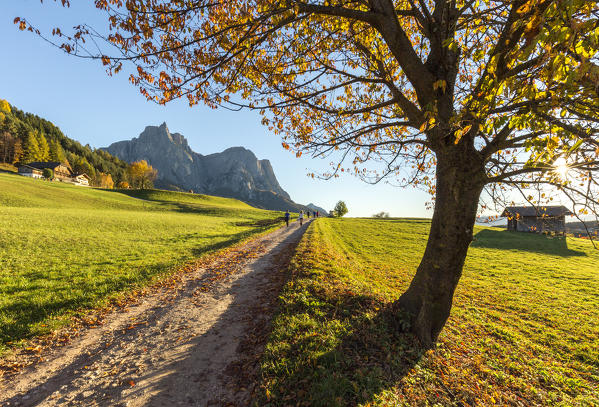 View of Sassolungo and Sassopiatto during autumn from Alpe di Siusi/Seiser Alm, Dolomites, province of Bolzano, South Tyrol, Italy