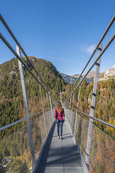 Reutte, Tyrol, Austria, Europe. Ehrenberg Castle and the Highline 179, the world’s longest pedestrian suspension bridge. A young woman cross the bridge