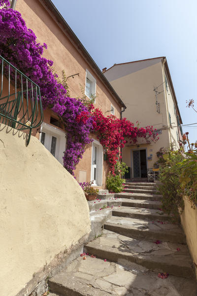 Flowers in the old alley, Porto Azzurro, Elba Island, Livorno Province, Tuscany, Italy