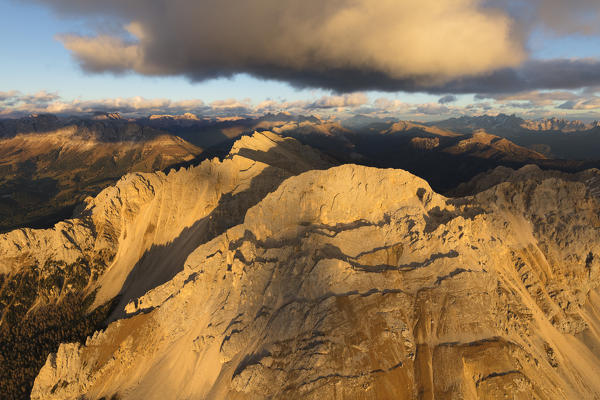 Aerial view of Latemar massif at sunset, Dolomites, South Tyrol, Italy