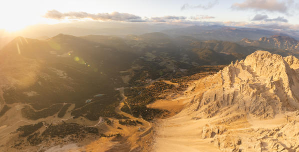 Panoramic aerial view of Latemar massif and Obereggen at sunset, Dolomites, South Tyrol, Italy
