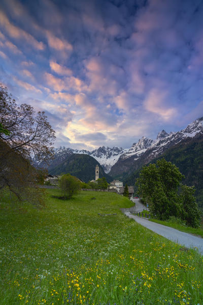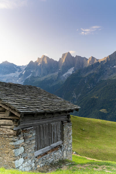 Sunrise on the rocky peaks, Soglio, Bregaglia Valley,  Maloja Region, Canton of Graubunden, Switzerland
