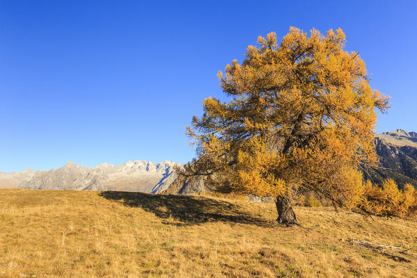 Isolated larch tree in autumn, Alpe Granda, Valtellina, province of Sondrio, Lombardy, Italy