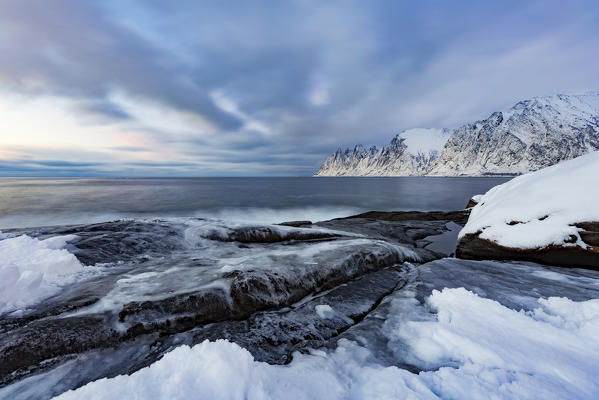 Shore of jevelens tanngard in front of okshornan peaks (devil's jaw) after sunset, senja, nordland, norway, europe