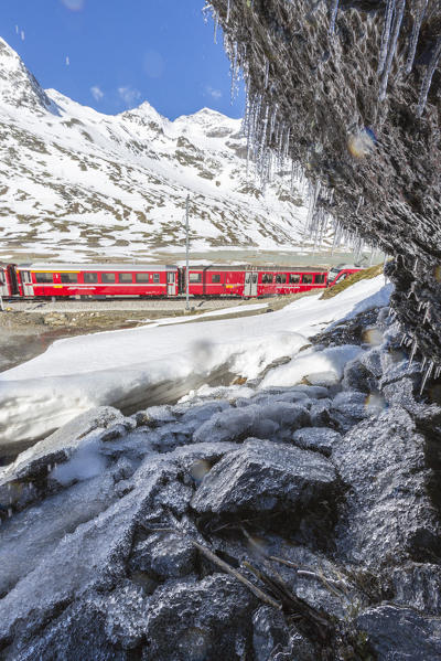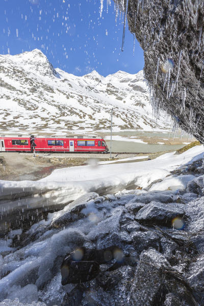 Hiker looks the Bernina Express train at Lago Bianco, Bernina Pass, canton of Graubunden, Engadine, Switzerland