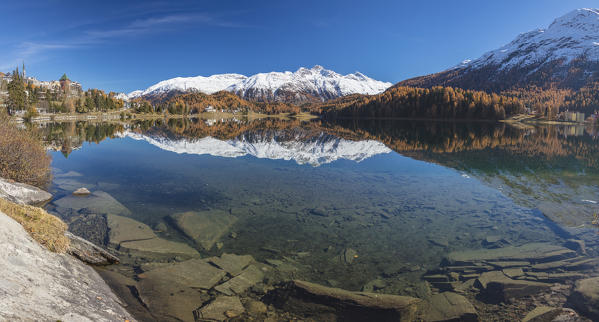 Snowy peaks reflected in lake during autumn, St Moritz, canton of Graubunden, Maloja District, Engadine, Switzerland