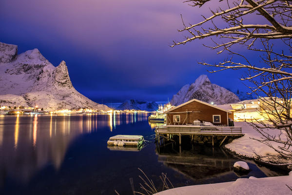 A rorbu, the typical Norwegian fishermen house, reflecting in the still water of the sea at the blue hour in Reine, Lofoten islands, Norway. Europe