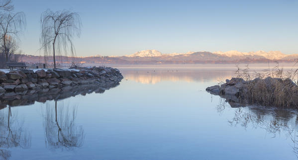 Sunrise on Rosa mount, pink reflections on lake Varese, Varese province, Lombardy, Italy, Europe