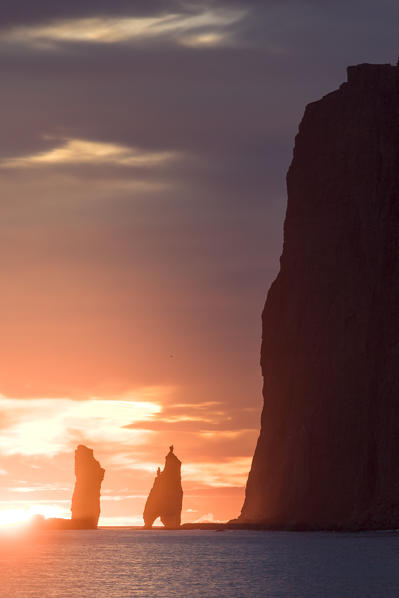 Cliffs of Risin og Kellingin at sunrise seen from Tjornuvik, Streymoy Island, Faroe Islands