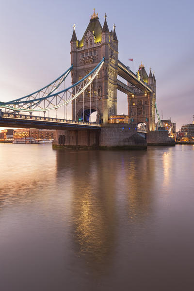 Tower Bridge at dawn reflected in river Thames, London, Great Britain, UK