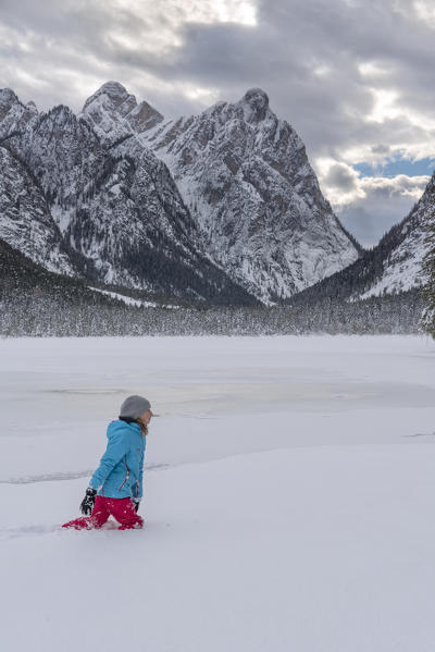 Dobbiaco/Toblach, province of Bolzano, South Tyrol, Italy. A child walks on winter lake