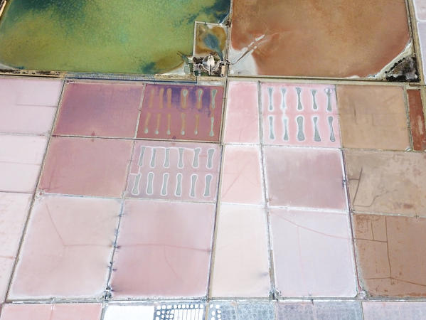 Aerial view of salt flats and windmills, Saline dello Stagnone, Marsala, province of Trapani, Sicily, Italy