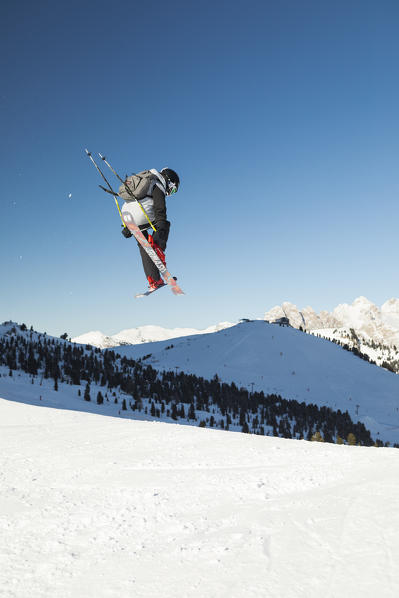 a view of a freestyler flying with his skis after a jump in Val Gardena, Bolzano province, South Tyrol, Trentino Alto Adige, Italy