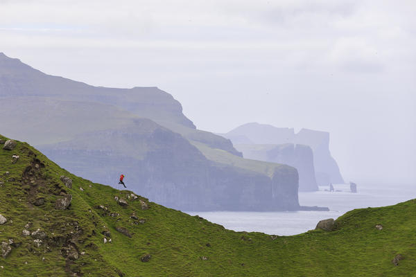 Lighthouse on islet known as Mykines Holmur, Mykines island, Faroe Islands, Denmark