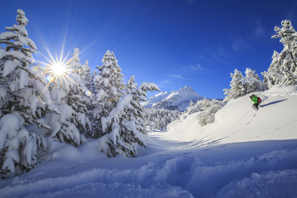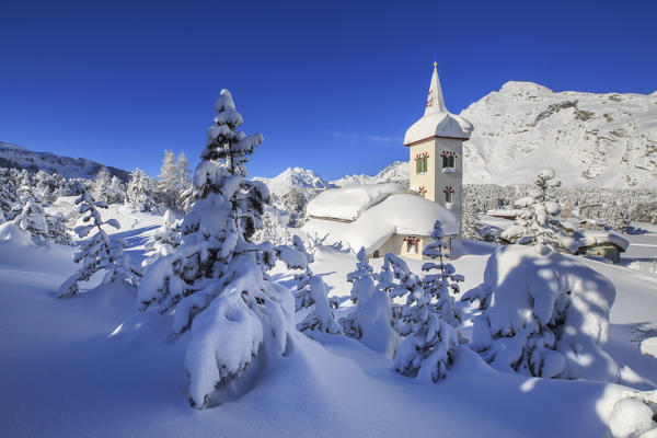 Photographer in action while the church tower frames the snowy peaks Maloja Pass Canton of Graubunden Switzerland