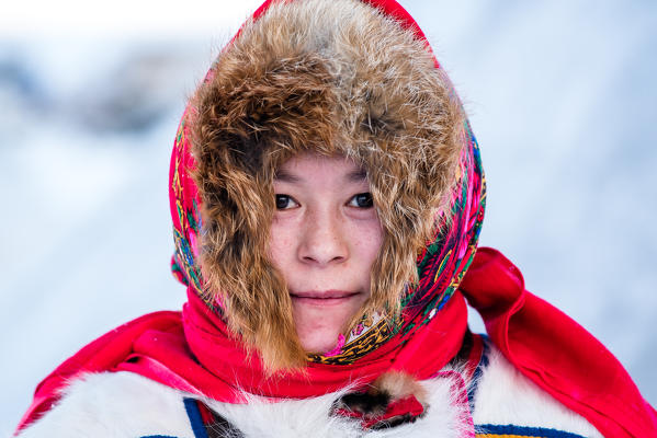 Nenets woman with the traditional fur coat at the nomadic reindeer herders camp. Polar Urals, Yamalo-Nenets autonomous okrug, Siberia, Russia