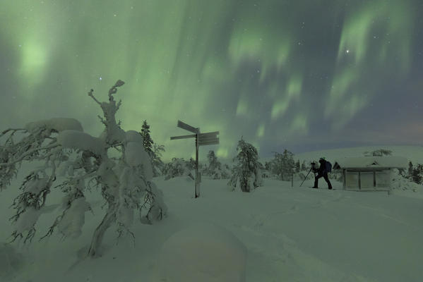 Photographer in the snowy woods during Northern Lights, Pallas-Yllastunturi National Park, Muonio, Lapland, Finland