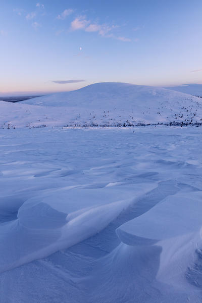 Dusk on the frozen landscape covered with snow, Pallas-Yllastunturi National Park, Muonio, Lapland, Finland