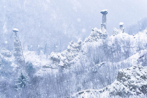 Zone Pyramids under the snow, Lombardy district, Brescia province, Italy.
