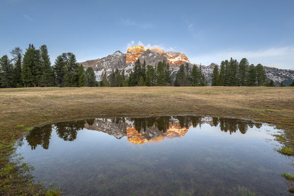 Prato Piazza/Plätzwiese, Dolomites, South Tyrol, Italy. The Croda Rossa d'Ampezzo is reflected at sunrise in a pool on the Prato Piazza
