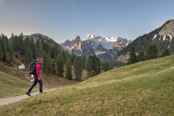 Prato Piazza/Plätzwiese, Dolomites, South Tyrol, Italy. A hiker on the Prato Piazza, in the background the Cristallo Massiv at sunrise