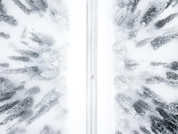 Aerial view of person lying down on road in the icy forest, Pallas-Yllastunturi National Park, Muonio, Lapland, Finland