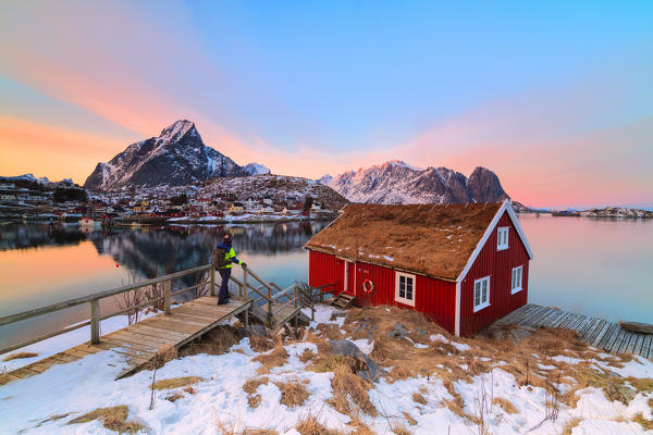 The snowy peak of Volanstinden seen from Fredvang, Lofoten Islands, Norway