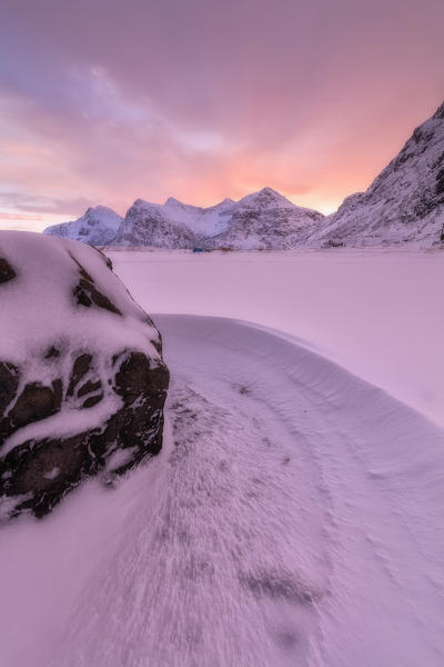 Snow on Skagsanden beach, Flakstad municipality, Lofoten Islands, Norway