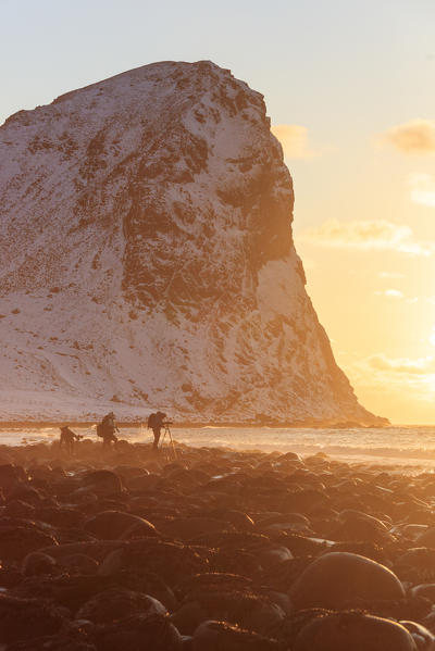Photographers at sunset, Unstad, Vestvagoy, Lofoten Islands, Norway