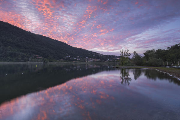 Sunrise on lake Pusiano with fire reflections, Lecco province, Brianza, Lombardy, Italy, Europe