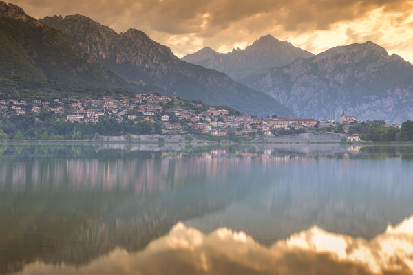 Fire sunrise on Lecco mountains, lake Annone, Lecco province, Brianza, Lombardy, Italy, Europe