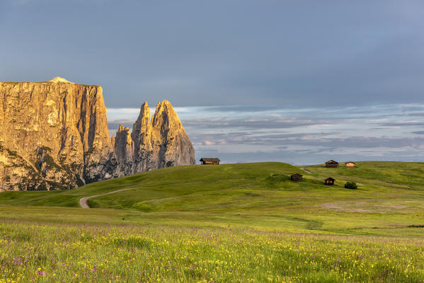 Alpe di Siusi/Seiser Alm, Dolomites, South Tyrol, Italy. Sunrise on the Alpe di Siusi with the peaks of Sciliar