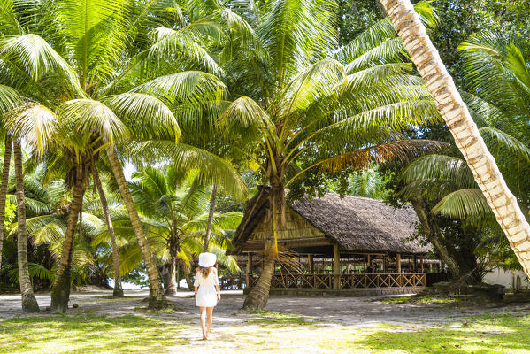 A tourist walking near the restaurant of Anse Lazio beach. Praslin island, Seychelles, Africa (MR)