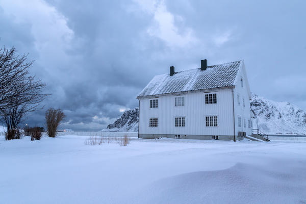 White house surrounded by snow in the frozen landscape at dusk Flakstad Lofoten Norway Europe