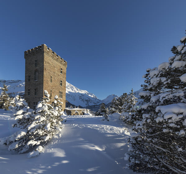 Panoramic of Belvedere Tower surrounded by snow, Maloja Pass, Bregaglia Valley, canton of Graubunden, Engadin, Switzerland