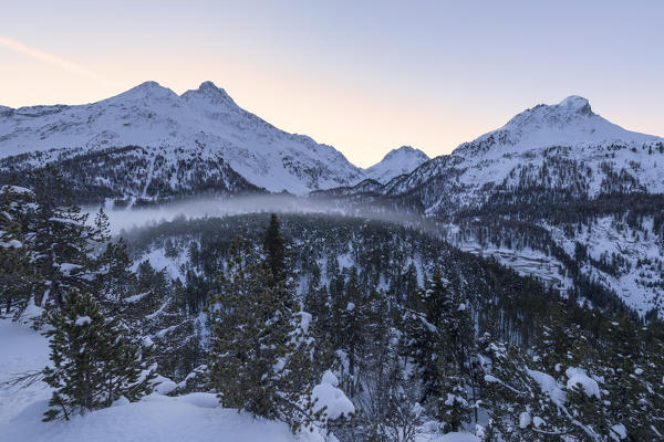 Snow covered trees, Maloja Pass, Bregaglia Valley, canton of Graubunden, Engadin, Switzerland