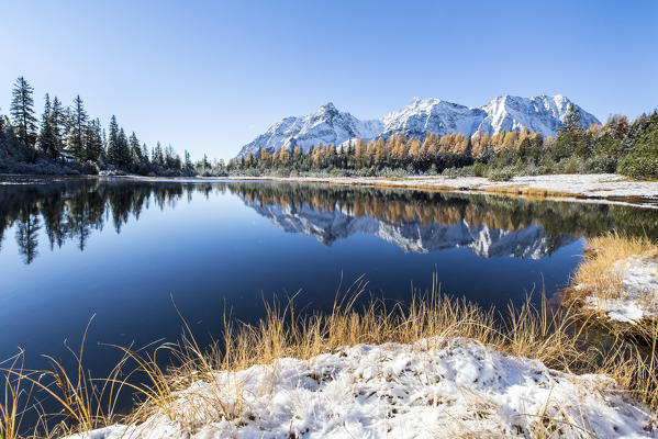 Snowy peaks and woods reflected in Lake Entova in autumn Malenco Valley province of Sondrio Valtellina Lombardy Italy Europe