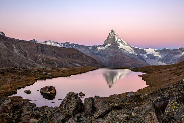 Pink sky at sunrise on the Matterhorn reflected in Stellisee. Zermatt Canton of Valais Pennine Alps Switzerland Europe