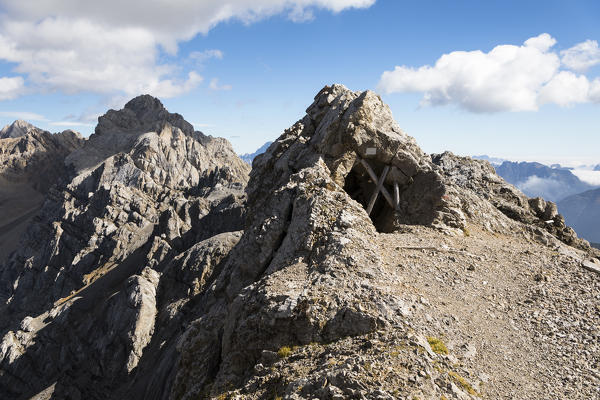 a climber is passing through the rocks along the via ferrata Bepi Zac on the battlefront of the World War One, Trento Province, Trentino Alto Adige, Italy