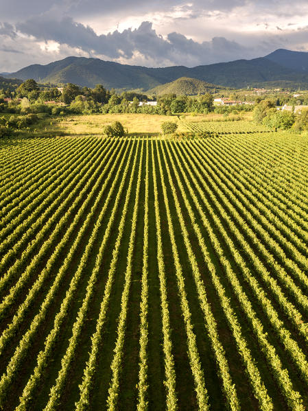 Aerial view of Franciacorta fields, Franciacorta, Brescia province, Lombardy district, Italy.