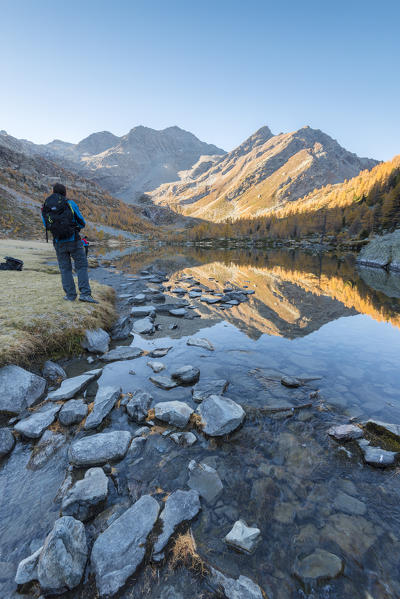 Photographer at Arpy Lake, Arpy valley, Valdigne, Aosta Valley, Italian alps, Italy