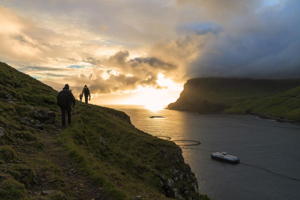 Photographers on footpath to Drangarnir rock Vagar island, Faroe Islands, Denmark