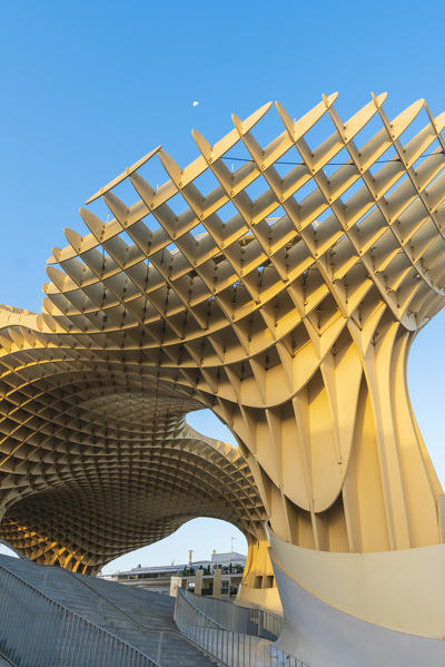 Reticular shapes of giant mushrooms of the futuristic Metropol Parasol, building of contemporary art made of wood and polyurethane also known as Setas de Sevilla, Plaza de la Encarnacion, Seville, Andalusia, Spain